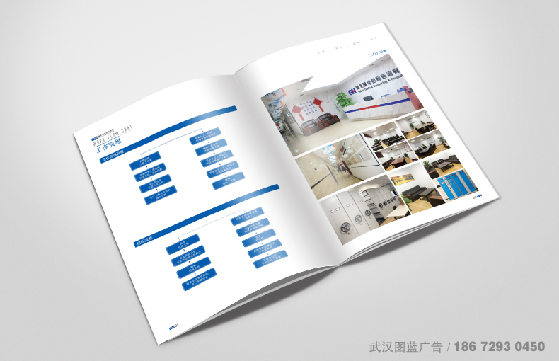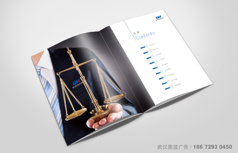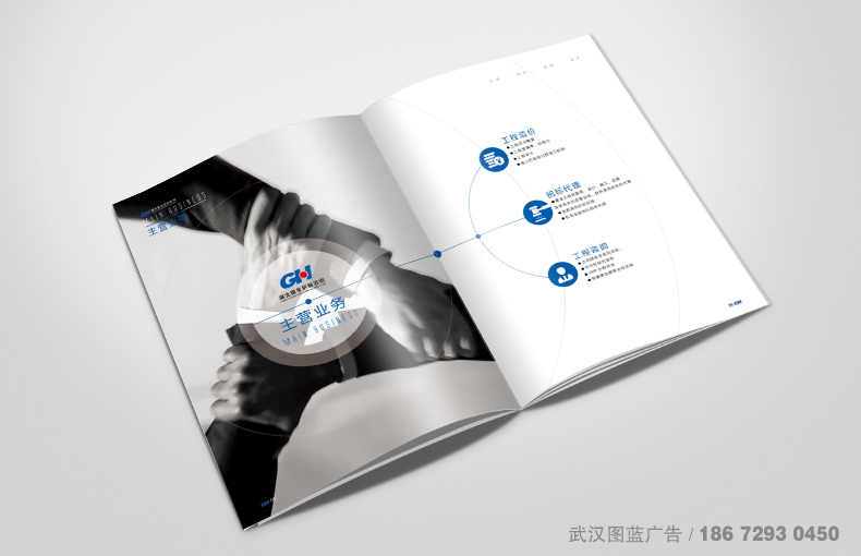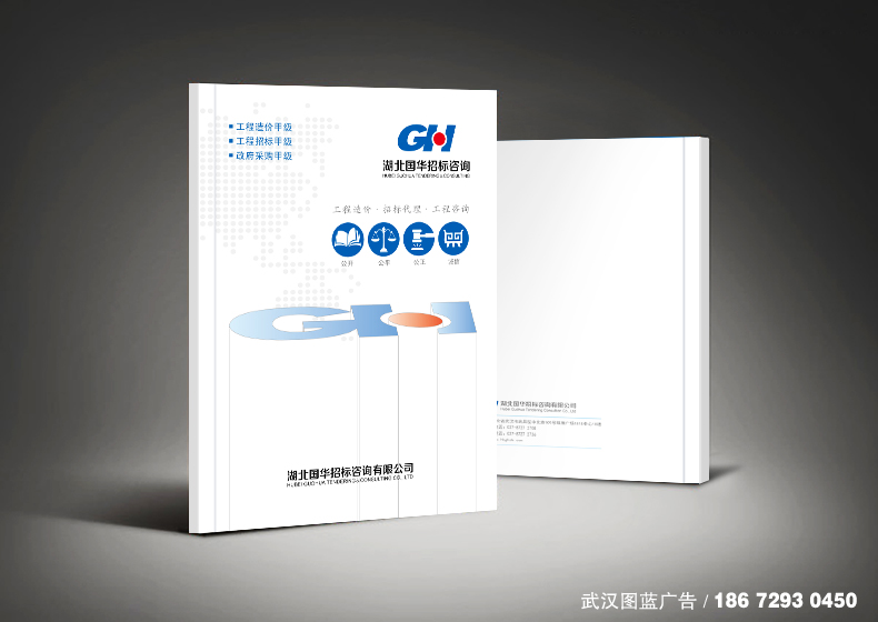 畫冊設計解決方案:整本畫冊的設計以其LOGO藍為主色調,畫冊封面以抽象而立體的LOGO為設計元素,簡潔而清爽。畫冊采用210x285mm的尺寸設計,以象征公平公正的“天秤”為設計元素,正好貼合“國華招標”公司的服務理念。